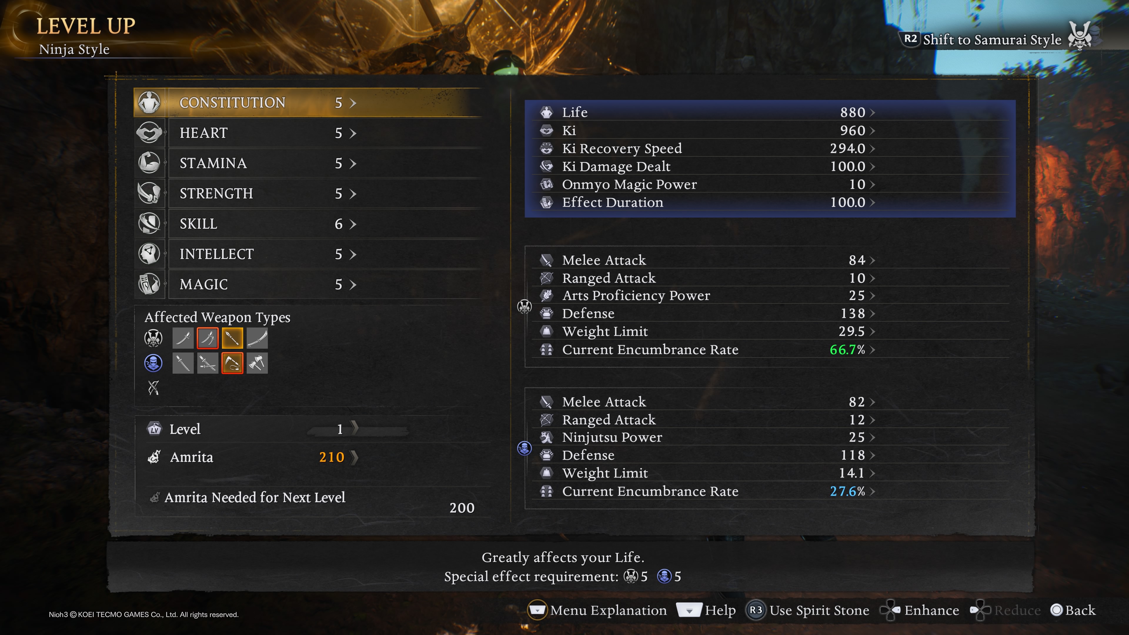 Nově lze přepínat mezi dvěma styly – ninjou a samurajem – a to přímo během soubojů. Ninja sází na rychlost a magii, samuraj na sílu a práci s výdrží Ki. Záleží jen na tobě, co ti sedne víc. Osobně mi přišla hra za ninju o něco výhodnější, hlavně díky obratnosti, ale silné samurajské útoky se zase hodí na dorážení nepřátel. Všechno do sebe perfektně zapadá, komba plynou přirozeně a soubojový systém je radost se učit.